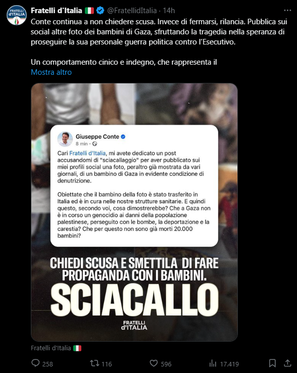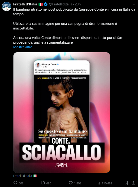 Alcuni giornali, come Open di Enrico Mentana, Libero, e persino il canale X ufficiale di Fratelli d’Italia, si sono affrettati a pubblicare articoli apparentemente “neutrali”, che confermano l’identità e la malattia di Osama, ma cercano sottilmente di neutralizzarne l’impatto emotivo e politico. “Sta bene”, titolano. Come se questo bastasse a cancellare l’inferno che ha vissuto. Come se il fatto che oggi sia curato in Italia smentisse ciò che le sue ossa gridavano solo poche settimane fa. Questo tipo di debunking non è giornalismo: è copertura morale del crimine, è maquillage della sofferenza. Non si può prendere atto della malattia genetica di un bambino e fingere che Gaza non sia una trappola letale per tutti i malati cronici. Non si può fingere che basti dire “fibrosi cistica” per assolvere chi ne ha affamato il corpo. Questo non è fact-checking. È complicità intellettuale.
