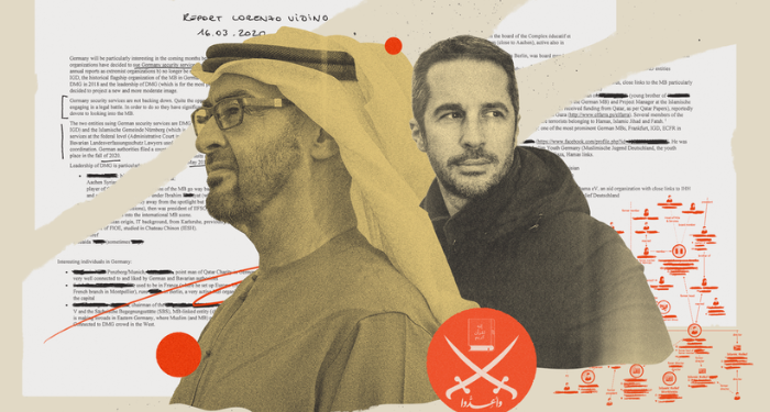 Secondo le inchieste di Mediapart e del consorzio European Investigative Collaborations (Abu Dhabi Secrets), tra 2017 e 2020 gli EAU hanno finanziato una società di intelligence privata svizzera (ALP Services), con oltre 5,5 milioni di euro, per produrre dossier contro più di 1.000 attivisti, studiosi e istituzioni islamiche in Europa.