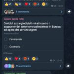 Recentemente, il gruppo ha attirato l’attenzione con un sondaggio inquietante denunciato su Instagram anche da Giuseppe Flavio Pagano, già nel mirino del gruppo che ha tentato di fargli perdere il post di lavoro: “Omicidi extra-giudiziali mirati contro i supporter del terrorismo palestinese in Europa, ad opera dei servizi segreti, sì o no?” L’esito del sondaggio è stato schiacciante: circa il 90% dei partecipanti ha votato a favore. La maggioranza dei partecipanti al sondaggio quindi si dichiara favorevole all’omicidio perpetrato sul territorio italiano svelando una disinvoltura allarmante dei membri del gruppo rispetto allo sdoganamento della violenza e del crimine. E così una delle tante reazione di soddisfacimento nel gruppo rispetto al risultato del sondaggio risulta essere “Tutti favorevoli!! Nemmeno le presidenziali in Uganda con 99.15% ci battono! A parte gli scherzi sono super d’accordo“.