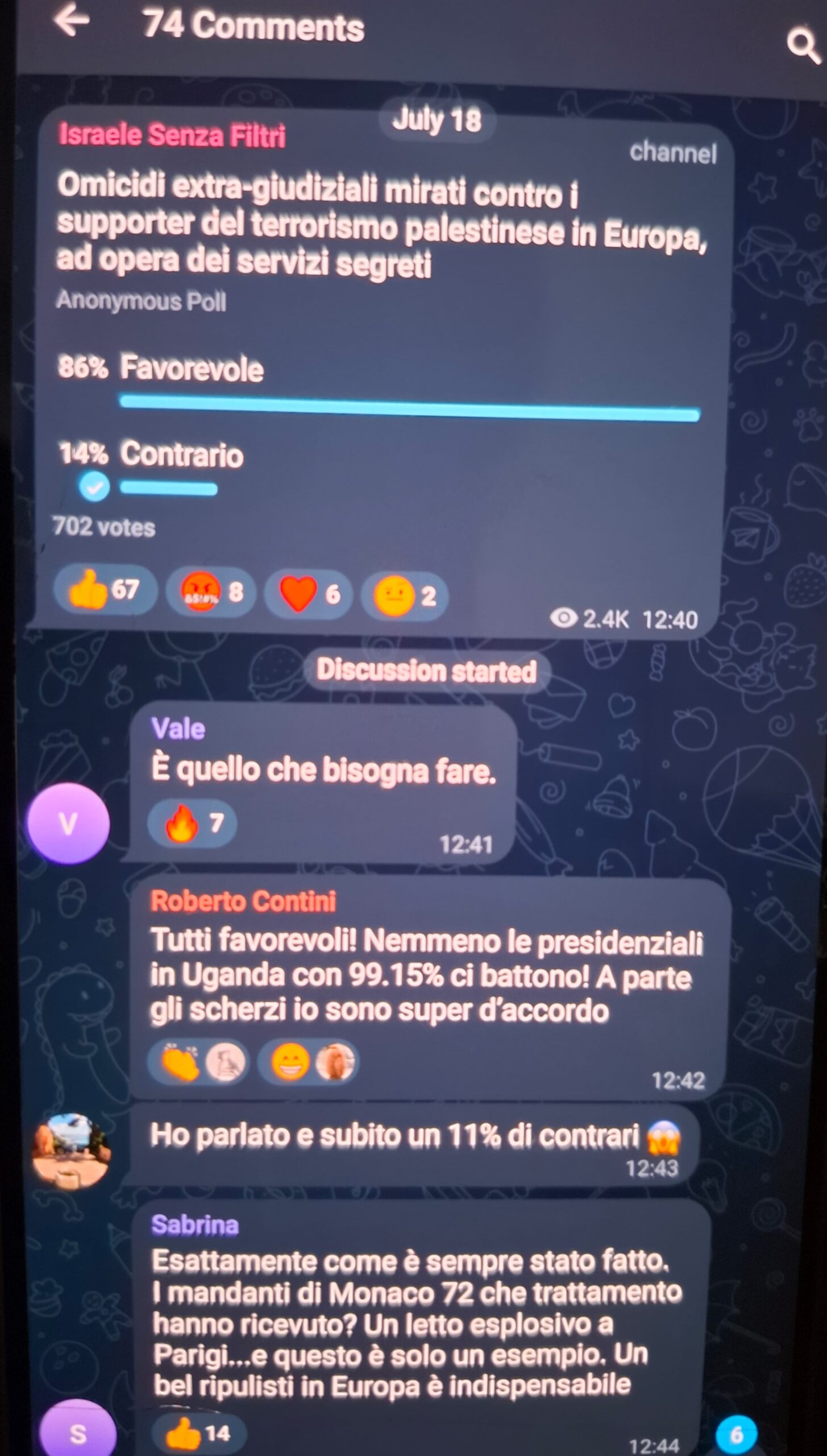 E sono proprio i commenti seguiti al sondaggio che dipingono un quadro ancora più inquietante: un utente ha scritto: “È quello che bisogna fare”. E ancora un altro membro del gruppo afferma “Esattamente come è sempre stato fatto. I mandanti di Monaco 72 che trattamento hanno ricevuto? Un letto esplosivo a Parigi…e questo è solo un esempio. Un bel ripulisti in Europa è indispensabile”. Questi commenti non evidentemente sono semplici espressioni di opinioni, ma riflettono una cultura di odio e violenza radicata.