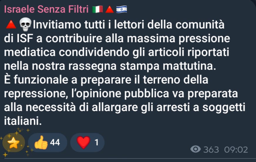 Non è un’impressione astratta. Nella galassia sionista italiana emergono istanze come quella del gruppo Telegram “Israele Senza Filtri”, che è stato oggetto di una inchiesta per aver teorizzato atti di terrorismo contro attivisti pro-Palestina in Europea; e oggi, negli stessi ambienti, circolano messaggi che invitano a “fare pressione mediatica” per “preparare il terreno alla repressione” e a “nuovi arresti anche di soggetti italiani”. Secondo quanto riportato, quel canale è attribuito a Dario Sanchez e Mikael Sfaradi, figure legate a una rete informativa israeliana con sede a Tel Aviv.