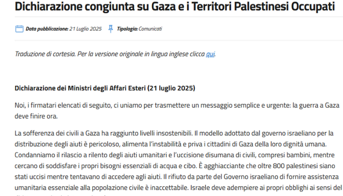 Gaza, i Ministri degli Esteri di 28 Paesi – tra cui l’Italia – chiedono la fine immediata della guerra